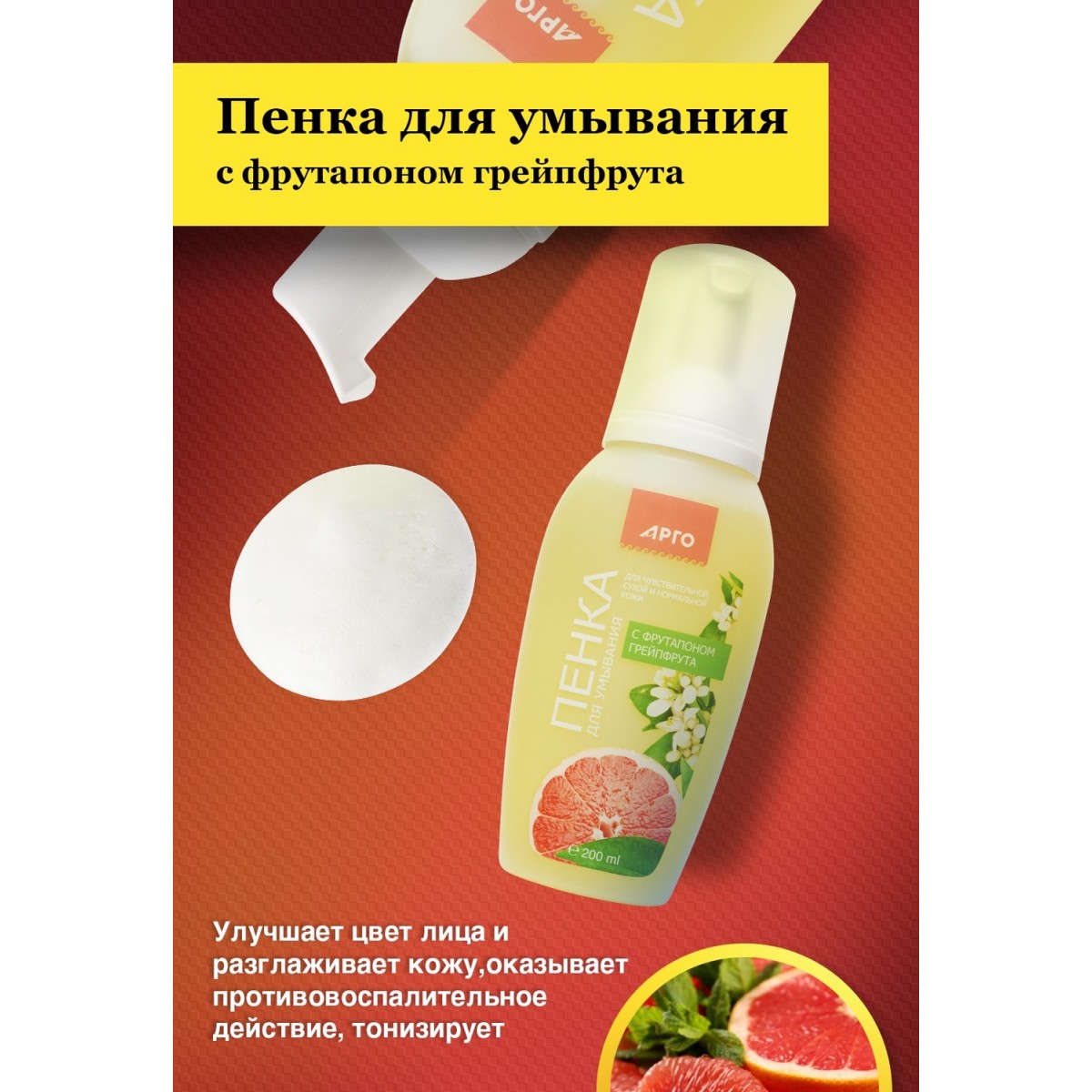 Фрутапон грейпфрута – смесь концентрата грейпфрута с экстрактом зеленого чая (натрия лаурет сульфат, кокамидопропил бетаин, дицил глюкозид, диметикон кополиол, ПЭГ-40 гидрогенизированное касторовое масло, Д-пантенол, токоферол ацетат, ретинол пальмитат, аскорбил фосфат, лимонная кислота, DMDM-гидантоин, парфюмерная композиция, полифенолы, кофеин, вода дистиллированная).