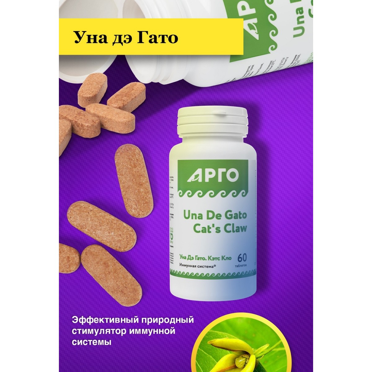 Уна Дэ Гато (Кошачий коготь) – эффективный природный стимулятор иммунной системы. Характеризуется противовоспалительным, противовирусным, антимикробным, антиоксидантным эффектами. Снижает риск тромбообразования, оказывает положительное воздействие на пищеварительную систему.