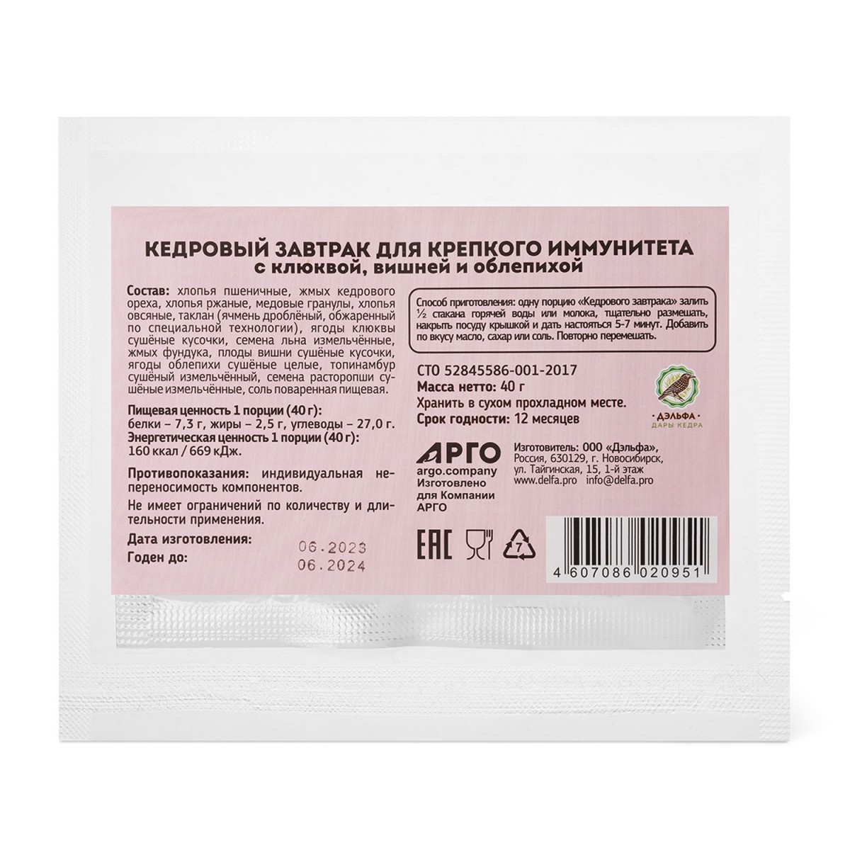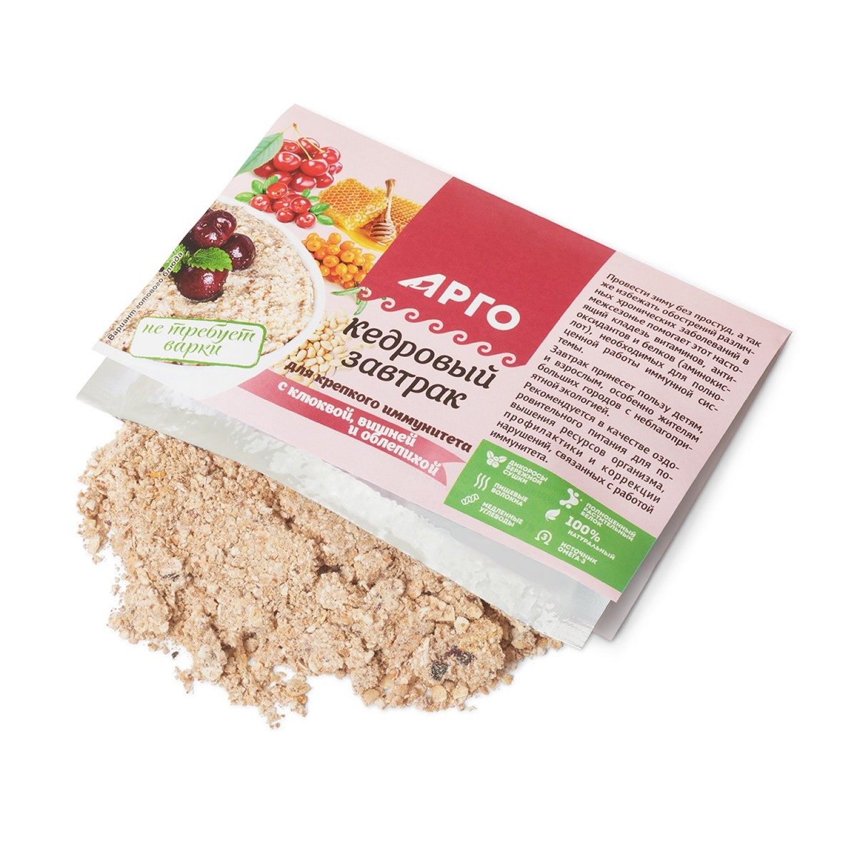 Комплекс антиоксидантов из клюквы, вишни, облепихи, меда обладает противовоспалительным действием повышает иммунитет улучшает состояние соединительной ткани, уменьшает проницаемость сосудов. Пищевые волокна овсяных, пшеничных, ржаных хлопьев, семян льна, жмыха фундука, кедрового ореха связывают и обезвреживают токсические вещества в кишечнике, улучшают состояние микрофлоры желудочно-кишечного тракта, повышают локальную иммунную защиту кишечника, снижают вероятность аллергических реакций.
