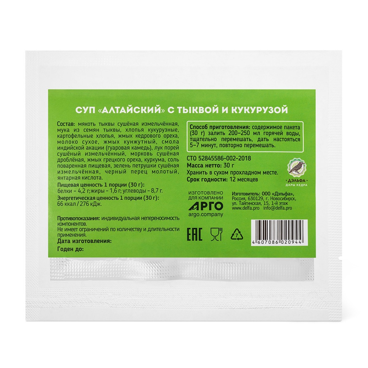 Мякоть тыквы сушёная измельчённая, хлопья кукурузные, картофельные хлопья, молоко сухое, жмых кедровый, жмых кунжутный, смола индийской акации (гуаровая камедь), лук порей сушёный измельчённый, морковь сушёная дроблёная, жмых грецкого ореха, соль поваренная пищевая, зелень петрушки сушёная измельчённая, чёрный перец молотый, янтарная кислота.